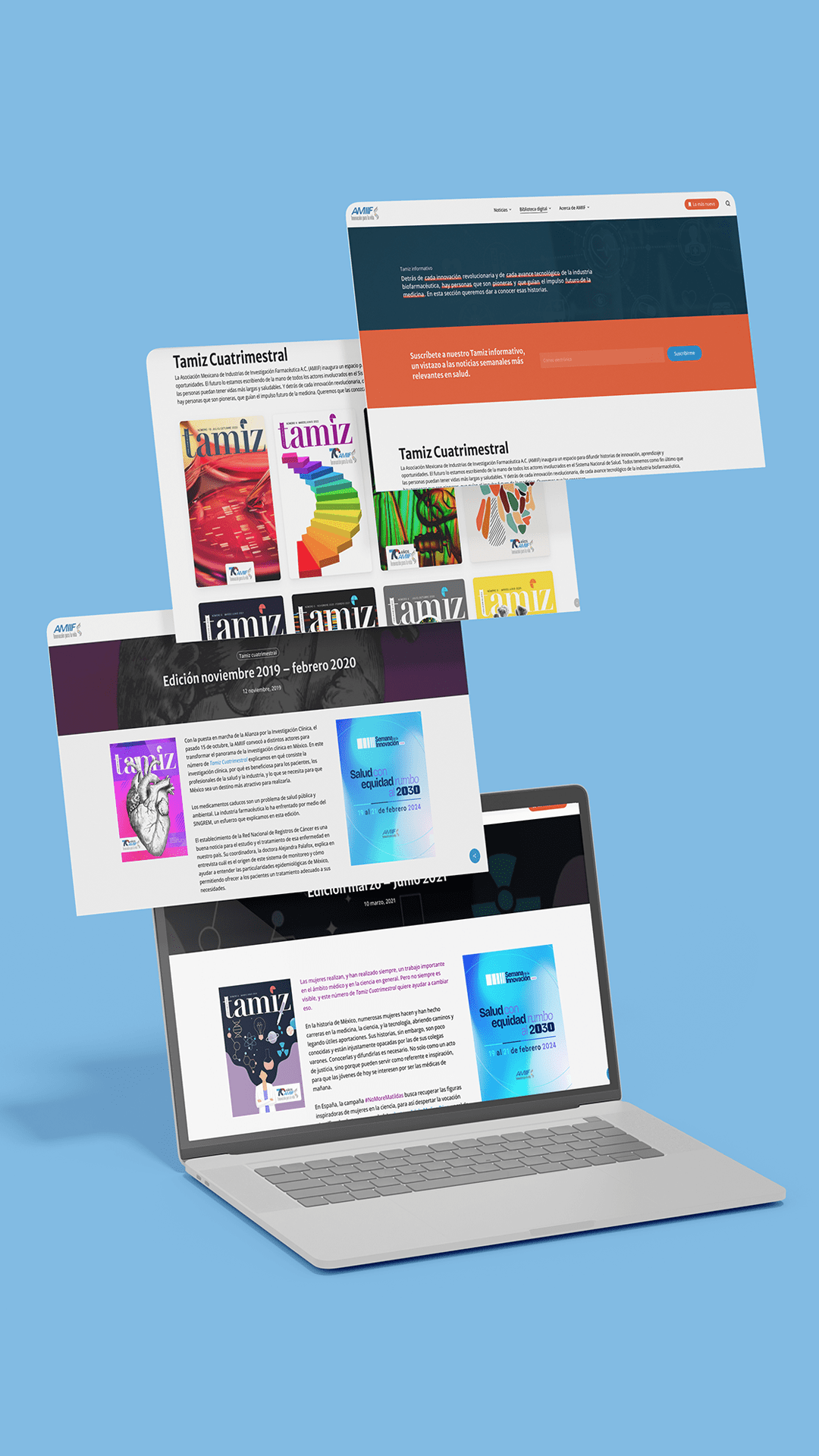 Rediseñamos el sitio web de AMIIF con un énfasis en la experiencia móvil. Dado que más del 90% de su audiencia accede al sitio desde sus dispositivos móviles, era crucial garantizar una experiencia óptima en estos dispositivos. Adicionalmente, buscamos reestructurar la arquitectura de la información para facilitar la navegación y mantener a los usuarios al tanto de las novedades.
